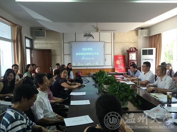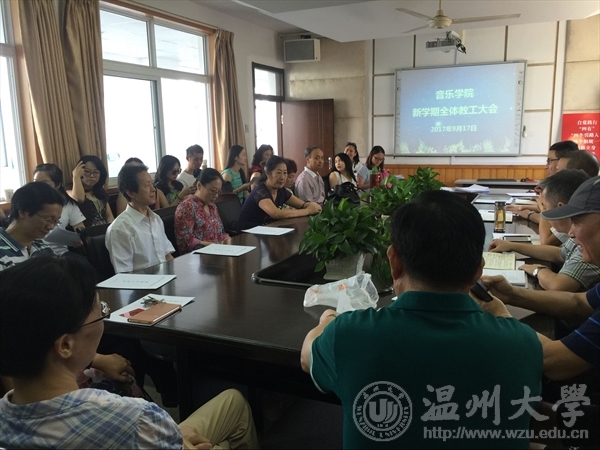 本次大会由赵玉卿院长主持。会议开始前,赵玉卿院长向与会教职工介绍了学院最新引进的张潇潇博士、钟芳芳博士两位新进教师;代表学院对两位教师表示欢迎并提出了殷切期望。会议正式议程中,赵玉卿院长首先从人才引进、成功举办中国古诗词吟诵音乐会、举办第二届文化回归活动、学院参加国务院第四轮学科评估申报以及学校自评申报工作、艺术学专业硕士硕士点申报工作以及学院2017年招生就业情况五个方面对学院上个学年的工作做了总结汇报。接着,赵玉卿院长向全体与会老师传达了温州大学党委中心理论组扩大会议关于“双创、产教融合”的会议精神。最后,赵玉卿院长从继续深化人才引进工作、主办好本学期全国学术会议和做好学院建院20周年活动三个方面对学院本学期总体工作做了说明安排。