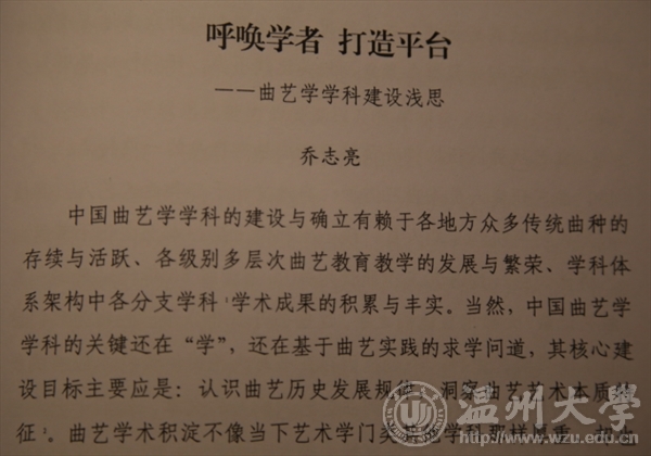 乔志亮教授应邀参会,并发表《呼唤学者 打造平台——曲艺学学科建设浅思》(载入峰会论文集)。近年温州大学曲艺研究所渐受业内关注,乔志亮所长被推举为中国文艺评论家协会曲艺杂技艺术委员会委员,中国曲艺家协会全国高等院校曲艺教育联盟成员,浙江省曲艺家协会理事,温州市曲艺家协会副主席。所成员即乔志亮、杨古侠、李葳正在撰写温州鼓词陈派艺术的文章,他们将为当地曲艺事业做点实事。