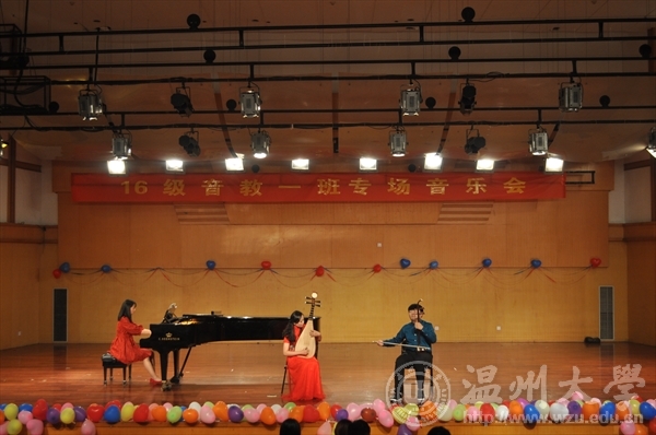 2016年12月13日晚18:30成人网站 在温州大学北校天瑞音乐厅举行教学实践周16音教1班的舞台音乐会——心相音,梦飞扬。本次舞台音乐会由该班全体学生演出,易雄志老师担任指导老师以及成人网站 全体老师出席此次舞台音乐会。