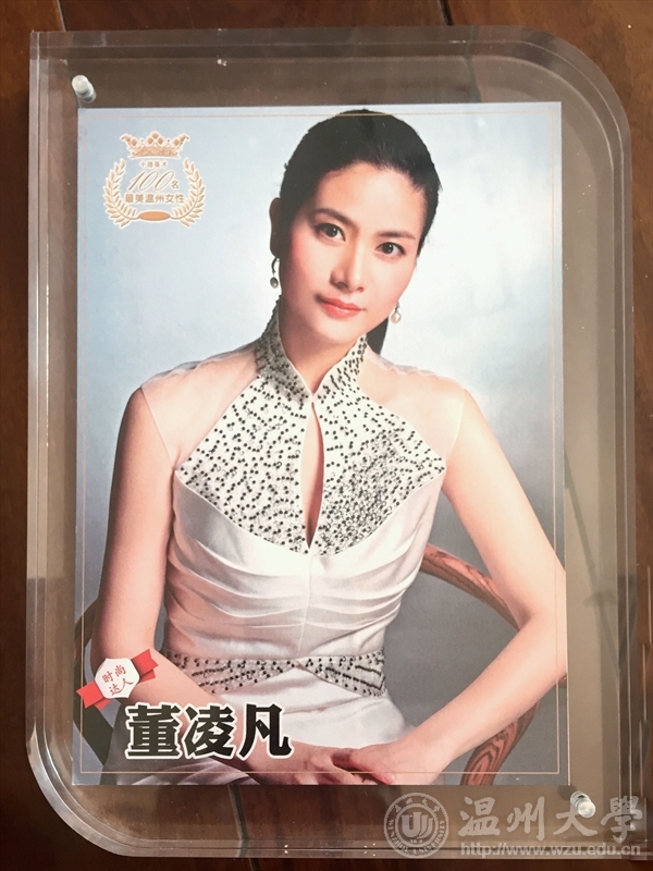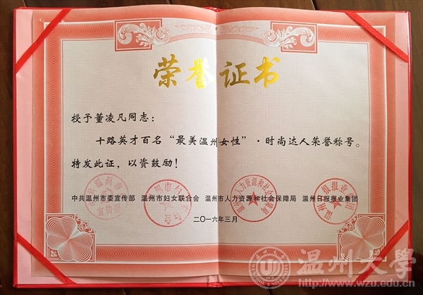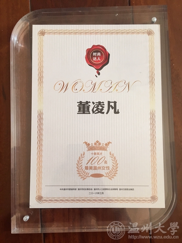巾帼建功十三五,美丽绽放在温州。2016年3月7日晚,温州市庆祝“三八”国际妇女节106 周年纪念大会暨十路英才百名“最美温州女性”颁奖庆典在温州市妇女儿童活动中心隆重举行。来自科研、金融、文化、农业、电商和旅游等十大领域的优秀女性代表——十路英才“最美温州女性”受到表彰,她们为各行各业女性树立了正面标杆和先进典型。温州大学琵琶,古筝副教授董凌凡荣誉入围温州市十路英才百名“最美温州女性”中的时尚达人。