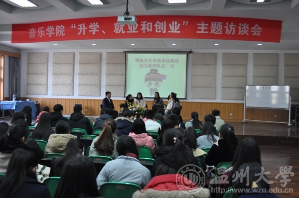 “升学、就业和创业”主题访谈会在温州大学音乐楼201隆重举办。本次“升学、就业和创业”主题访谈会邀请到了01级校友温州市天之音艺校校长陈红红、温州市岠江小学教师黄怡甜、成人网站