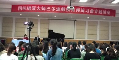 和对被授予聘书的愉悦心情,本次专题讲座他会就自己在温州大师音乐会上的12首肖邦练习曲对大家讲解其中的难点与解决。他认为在接触肖邦的过程中,最重要的是技巧与音乐的巧妙结合。那个时期,钢琴这种乐器还比较新兴,处于研发的状态。像著名的作曲家车尔尼,他较早的作品都为音型类。肖邦的出现使练习曲变成了艺术品。每首练习曲里都有技巧,像小巧的歌曲一样,是有目的的,不同的练习曲有不同的个性。肖邦写练习曲是作为整体来写的,巴赫的平均律是从乐理上开发调式,不是从整体演奏。所有练习曲都是相关的,能过渡到下一个练习曲,在此之间建立调性终止式。巴尔迪教授示范两首练习曲是如何用调性终止式过渡连接起来,像第二首练习曲《奏鸣曲》是以第一首练习曲《诙谐曲》的终止式结束作为开头,肖邦是用终止式把所有练习曲连接起来。接下来巴尔迪教授为大家分解肖邦练习曲的难点:第一首练习曲,要求手一定要有弹性,在放松的基础上,手张开要比一般曲子大,因为多数音程是11、12度,而缩拢的时候音程只有3度,这样会让手不舒服。处理难点时,不要忘记主旋律在左手,左手音要延长,右手同时也会勾画出旋律。第二首练习曲指法主要是缩拢,难点是要用最柔弱的3、4、5指来回跑动,所以要找出口手指放松,这样不至于僵死,在一个把位跳到另一个把位之间迅速放松。第三首练习曲在音乐上有挑战性,需要非常连得歌唱的声音。肖邦称这首为“最美丽的旋律”,所以要找到其中的平衡等。最后巴尔迪教授给出了在座人员提问时间。一位同学提问在第六首练习曲时,保持是用踏板还是手指?巴尔迪教授谦虚的说他更建议两个一起用,手指踏板和真正的踏板协调运用。他表示演奏是寻求音乐,而不是技术。