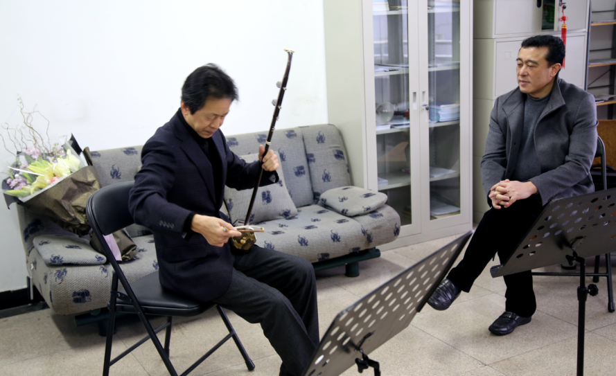 ,在学院刘青松书记、赵玉卿院长的陪同下,他们来到乔老师上课的外语楼教室,对乔教授进行亲切慰问,并送上鲜花,表达了学校党委对乔老师的感谢和祝福之情。薛校长高度赞赏了乔教授几十年如一日对教学岗位的默默坚守,和对学术研究的执着追求的精神。之后,大家还饶有兴趣的聆听了乔教授即兴演奏的二胡曲目《赛马》。参加本次慰问活动的,还有学校教务处周荣副处长。