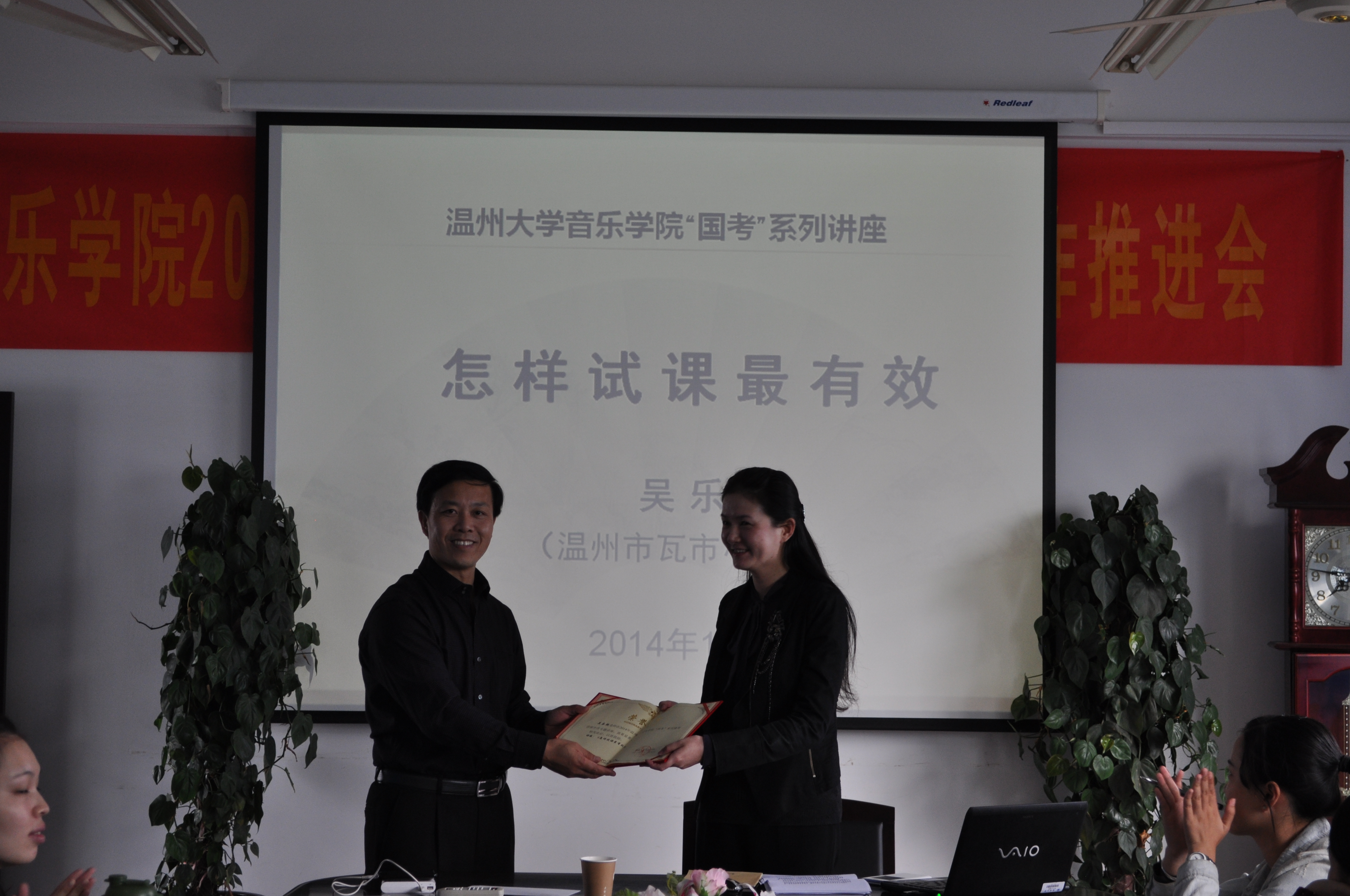 2014年11月7日下午,温州市优秀教师、教坛新秀,瓦市小学音乐教师吴乐艳莅临成人网站 ,指点学生“试课”的有效途径。温州大学教学督导王守琢老师与成人网站 的同学们一起参与了交流。该活动由王文韬副院长主持。 吴乐艳老师就学生“国考”、“考编”之音乐教师国家资格考试过程中的试课环节,给予音乐学、音乐表演专业的学生有益指导。她建议应考的同学,一定要熟悉现行的各个版本的音乐教材,同时要打好“自弹自唱”的技术难关。