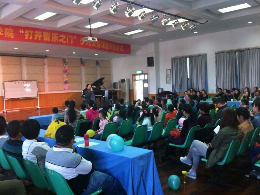 2013年11月16日上午9点,少儿音乐知识公益课堂在北校音乐楼201正式开班。学院领导及负责老师,报名的小朋友与家长都参与到了开班仪式中,开班由王文韬副院长主持并介绍本堂授课老师——张辉伟老师为公益课堂上音乐知识入门课,通过安静小朋友的方式讲了乐音和噪音的区别,并通过做小游戏了解了休止符极其作用,让小朋友初步了解并充分掌握基础。最后通过小朋友个人才艺展示让讲师成员了解各个小朋友并且给每个小朋友都安排了指点老师。