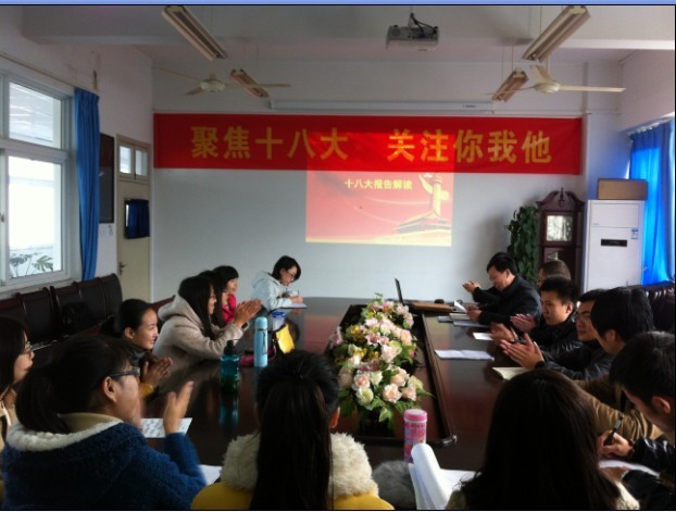 研究生支部在309会议室开展了学习“十八大精神”主题活动。研究生支部全体党员及入党积极分子参加了该活动。支部还特邀林海红老师参加了本次活动。学习“十八大精神”的主题活动由成人网站