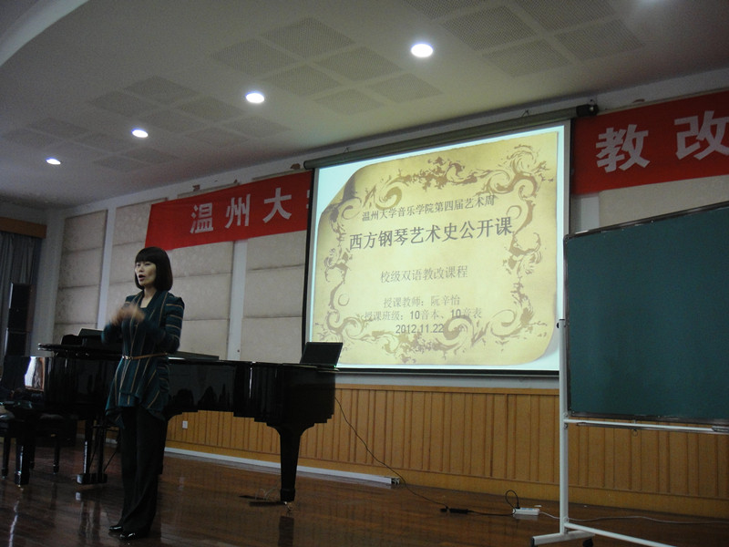 还推出了“课堂教学创新”系列活动。阮辛怡老师的《钢琴艺术史》双语课程,作为校级公开课,得到了温州大学教育中心胡来林主任及院内外听课领导、教师的高度评价。温州大学督导王守琢老师说:“这是在我近五年任温州大学教学督导工作过程中,听到的最好的一堂课,值得向其它学院推广、学习。”