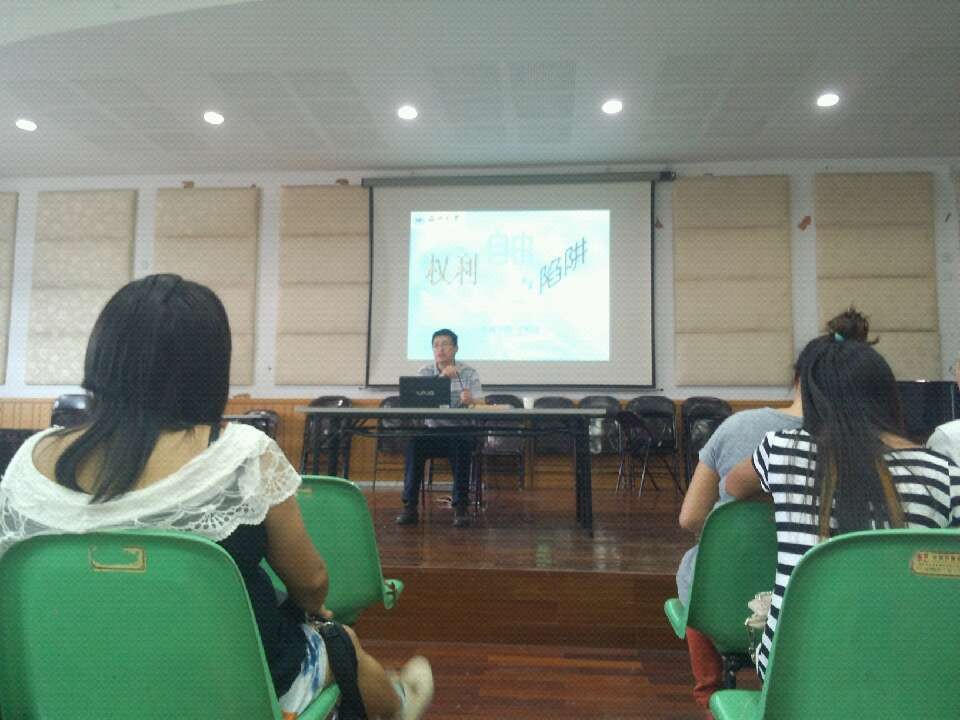 在音乐楼201举办了一场“权利自由与陷阱——关于宗教信仰与传销的法律问题”讲座,并邀请了法政学院党总支书记王柏民教授给新生讲课。