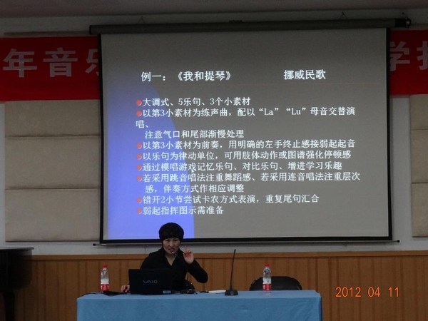 钱老师围绕师范生如何说课展开了详细的论述。讲座中,钱老师用了充分的案例分析,运用通俗易懂的语言进行解释,这使同学们对音乐教育有了新的认识。为了能够更好地让大家运用掌握的知识,钱老师把同学们分成四组,按照说课的四个方面给每一大组安排了不同的任务,并要求大家在10分钟的准备后推选代表上台发言。激烈的讨论过后,每组代表上台阐述了观点,钱老师对每一组的发言都进行了细致、到位的评价,用形象生动的语言与肢体动作,将每一个音乐知识如何更好的教给学生做了示范。最让大家心服口服的是钱老师不仅歌唱得好,还能在必要时加入些肢体动作,使知识更形象化。在这次讲座中,每位师范生都有不小的收获。