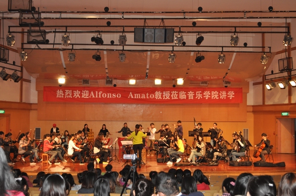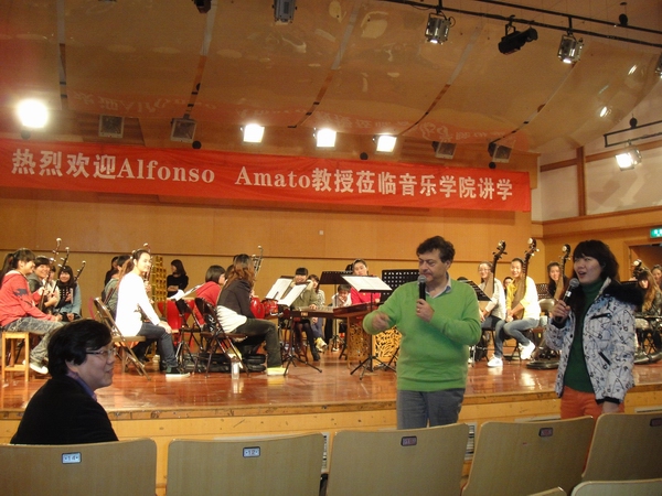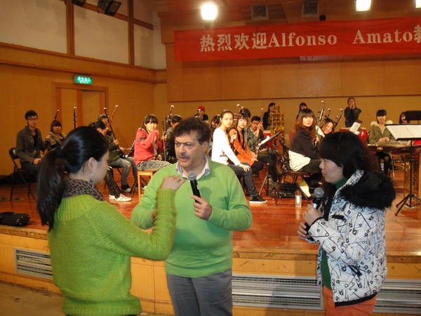 当意大利专家Alfonso听到我们乐队的《龙腾虎跃》演奏之后,深深为之震撼。特别是了解到这个民乐团成立时间还未满一年,则更是对我们团员的刻苦努力加以赞许,同时也给我们提出了众多宝贵的意见。尤其是对打鼓的同学,他要求我们的“小Baby”们要把每个鼓点更清晰的表达出来。由于他看到我们乐队的成员都非常的可爱,因此亲切的称我们为“小Baby”。在指导乐团排练的同时,他也和担任指挥的董凌凡老师分享了几点自己的独到见解。