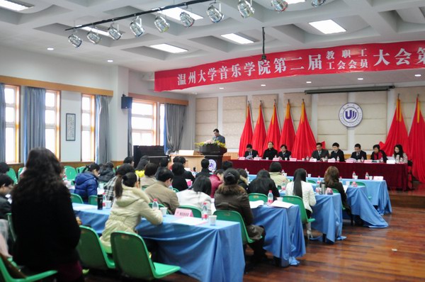 第二届教职工暨工会会员大会第一次会议在北校音乐楼201隆重召开。温州大学副校长任柏强、校工会副主席钟锦川及全院教职工参加了会议。
