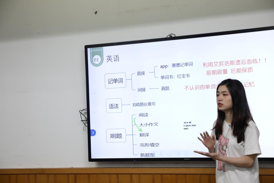紧接着是刘静怡学姐分享的考研小心得。她主要是针对英语、政治、中西音乐史以及和声曲式的复习进行经验分享。她详细的介绍了英语背单词、语法、刷题、阅读的小技巧,在场的同学们都齐刷刷地拍照记笔记,纷纷表示受益匪浅。她特别指出,政治复习要从暑假就开始,前期复习选择题,后期要疯狂背诵加默写。中西音乐史的复习分为三步骤:一是整理背诵资料(7月中旬前完成),二是背背背(制定背诵计划),三是默默默。关于和声曲式这一块,她提醒到一定要找专业老师或者机构上课,并且要提前了解报考学校的考试内容和题型。